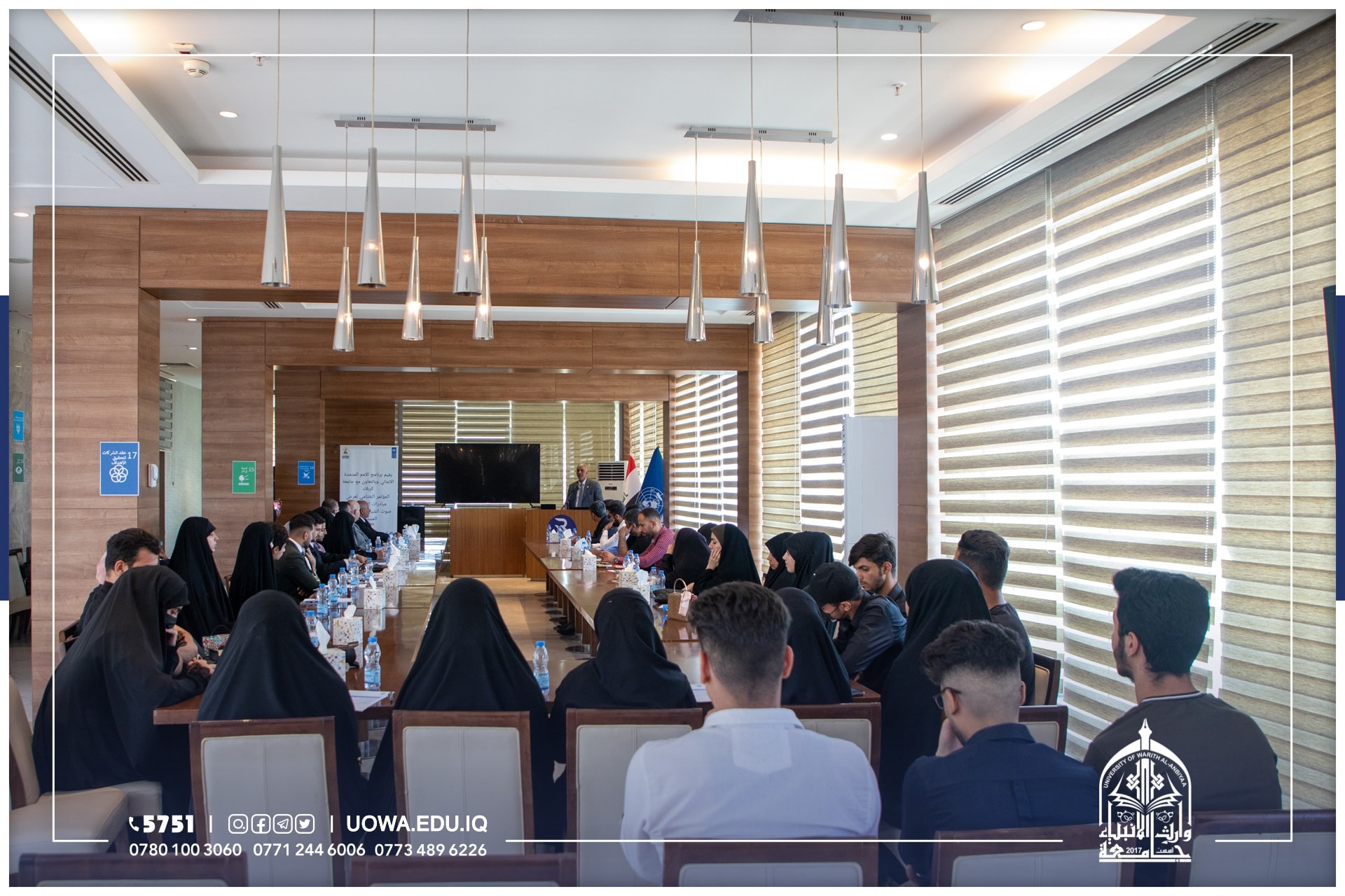 شارك طلبة جامعة وارث الانبياء(عليه السلام) بحضور المساعد العلمي الاستاذ الدكتور عباس الدعمي ومحافظ كربلاء المهندس نصيف جاسم الخطابي، ورئيس جامعة كربلاء الاستاذ الدكتور باسم السعيدي، في "المؤتمر الختامي لعرض مبادرات الشباب في التنمية المستدامة" الذي اقامه البرنامج الانمائي للامم المتحدة.