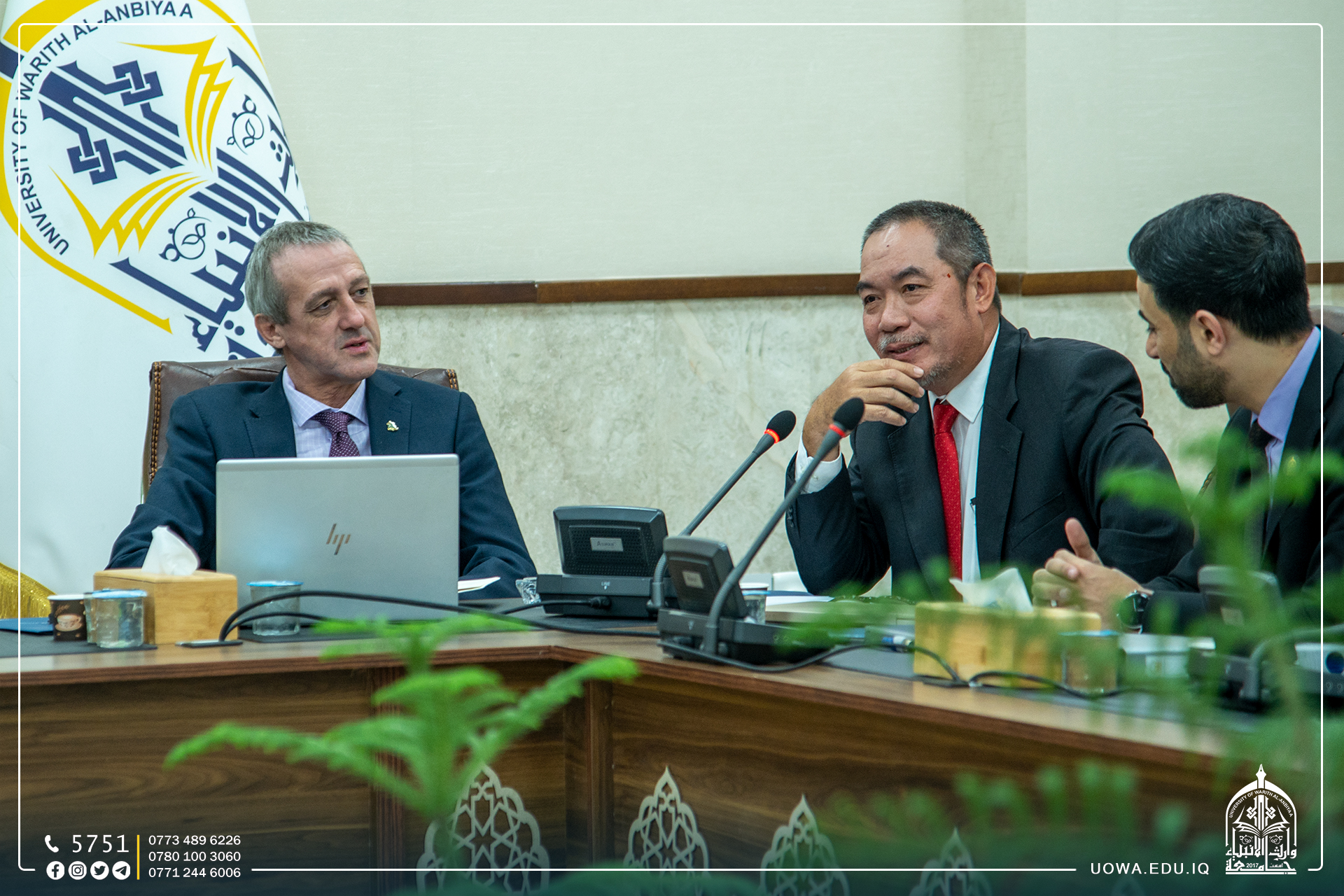 وقال البروفيسور طلال يوسف عميد الدراسات العاليا والتكنولوجيا المستجدة في كوينزلاند في استراليا: نحن فريق دولي يتضمن عدد من الجامعات جاءت زيارتنا الى جامعة وارث الانبياء(عليه السلام) الفتية لتبادل الاراء والتعلم من بعضنا البعض، والاستفادة من تجارب الجامعات العالمية والتباحث حول مواطن القوة التي تمتلكها الجامعة لتتم مخاطبة وزارة التعليم العراقية لتعميم التجربة، فضلاً عن التباحث حول مواطن الضعف لنعمل سوياً على إصلاحها عبر الإفادة من تجارب الجامعات العالمية للخروج بنتائج مرضية.