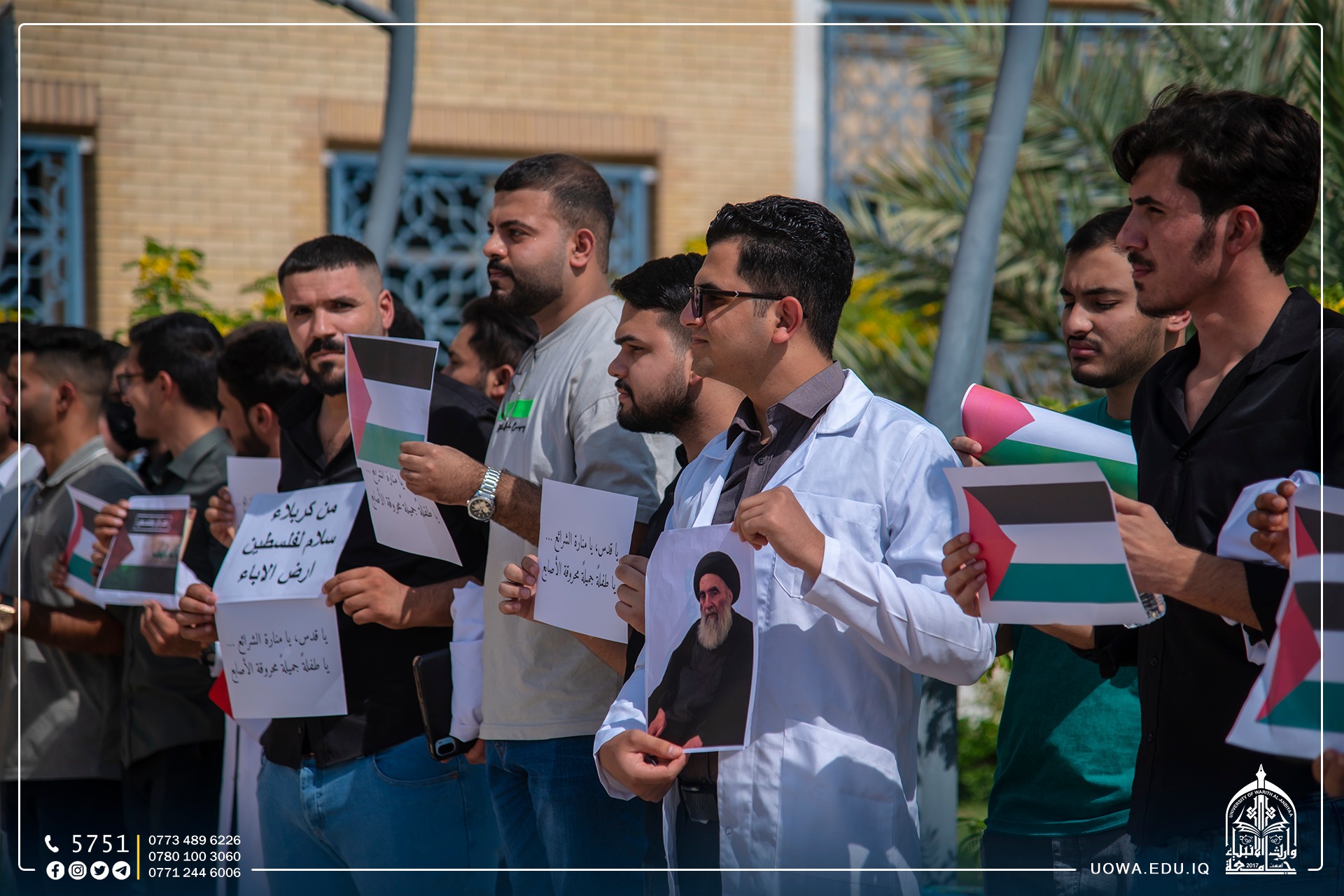 جامعة وارث الانبياء(عليه السلام) تنظم وقفة تضامنية مع الشعب الفلسطيني، وتؤكد مساندتها للشعب الفلسطيني الأبيّ في مقاومته الباسلة للمحتلين، وإن العالم كله مدعوّ للوقوف في وجه هذا التوحش الفظيع ومنع تمادي قوات الاحتلال عن تنفيذ مخططاتها لإلحاق مزيد من الأذى بالشعب الفلسطيني المظلوم، ويجري هذا بمرأى ومسمع العالم كله ولا رادع ولا مانع، بل هناك من يساند هذه الأعمال الإجرامية ويبرّرها بذريعة الدفاع عن النفس!