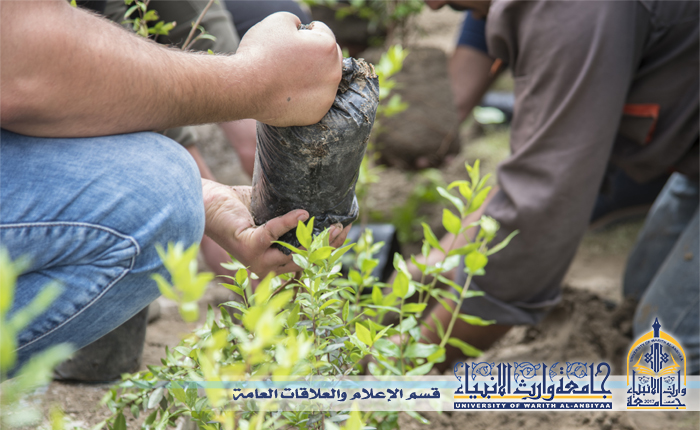 طلبة كلية الادارة والاقتصاد مع رئيس الجامعة أ .د طالب الموسوي يتشاركون غرس شتلات الاشجار في حدائق جامعة وارث الانبياء عليه السلام لتنمية القيم البيئية.
