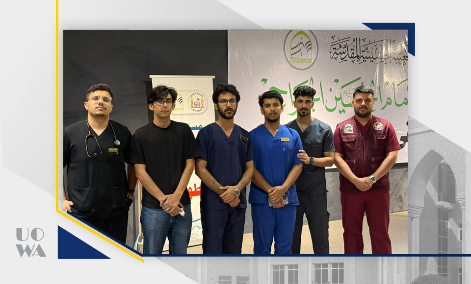 As part of the humanitarian and service role of Warith Al-Anbiya University (peace be upon him), during the Arbaeen pilgrimage, a number of students from the College of Medicine participated in providing medical and therapeutic services as part of the medical staff at the Imam Hussein Ambassador Hospital. This field participation was under the direct supervision and attendance of the Dean of the College, Professor Dr. Ali Abdul Saadoun Al-Ghazi; the Assistant Dean for Academic Affairs, Dr. Laith Muhammad Abbas Al-Husseini; and the Director of Legal Affairs, Dr. Sabah Muhammad Al-Jubouri. They inspected the work sites and learned about the nature of the services provided by the students to the honorable visitors, which included medical examinations, treatment, first aid, and health guidance services.