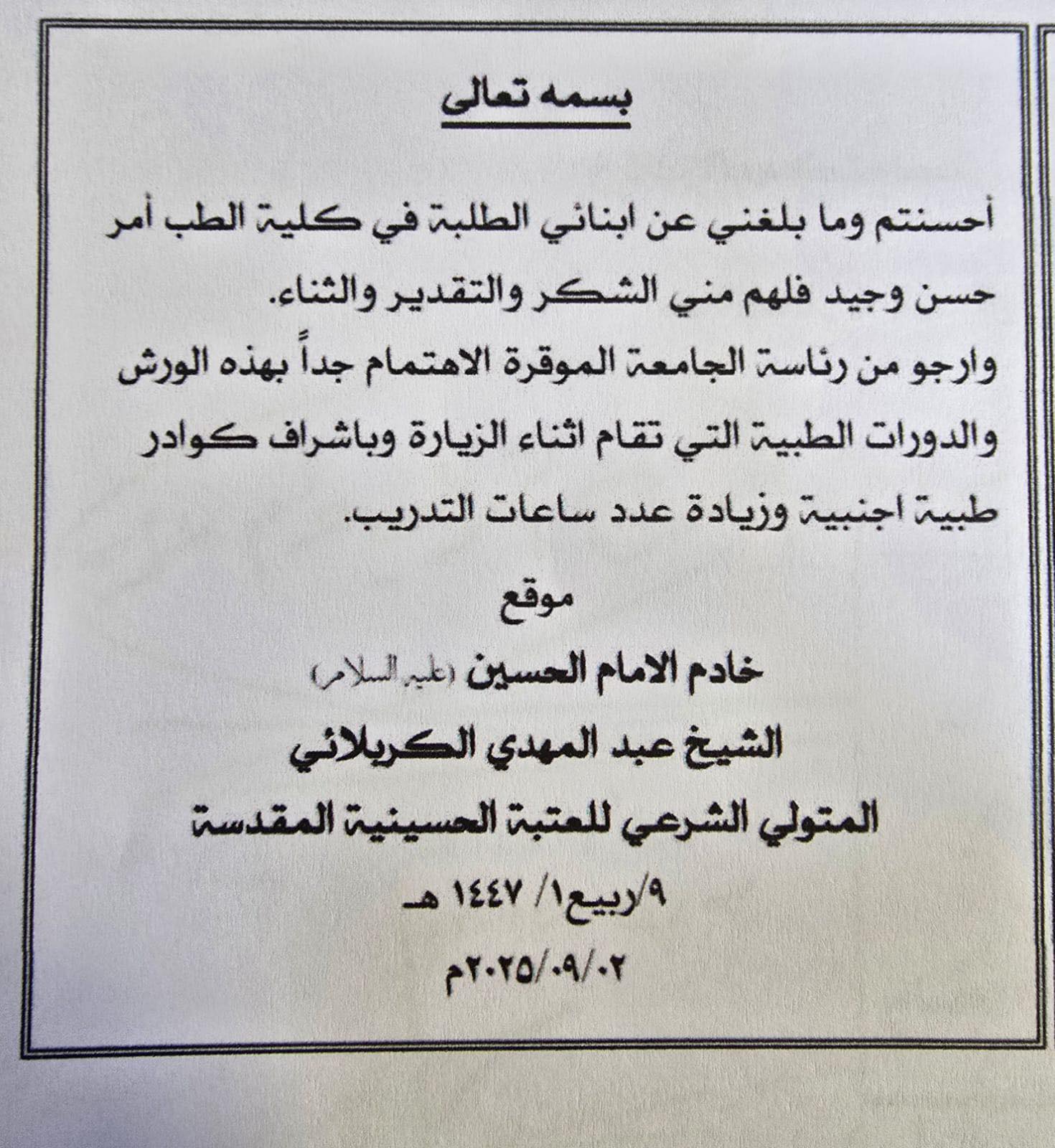 This initiative reflects the university’s commitment to social responsibility and aligns with Sustainable Development Goal 16: Peace, Justice, and Strong Institutions, by strengthening institutional roles in protecting individuals and ensuring their rights. It also supports Goal 17: Partnerships for the Goals, through effective collaboration with the Holy Shrine of Imam Hussain (PBUH) to serve pilgrims.